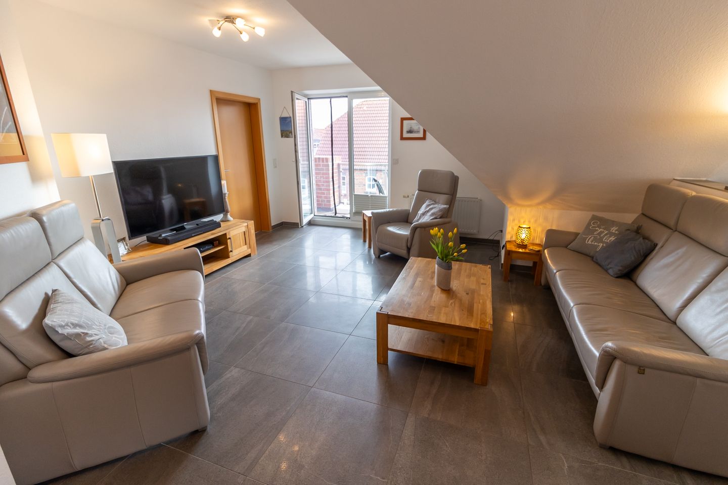 Das stilvoll eingerichtete Wohnzimmer bietet eine großzügige Ledercouchgarnitur, einen elektrischen Sessel und Zugang zur Loggia, die mit einem Tisch und Stühlen ausgestattet ist. Genießen Sie Ihren Aufenthalt in "Crevette" in dieser komfortablen und einladenden Umgebung.