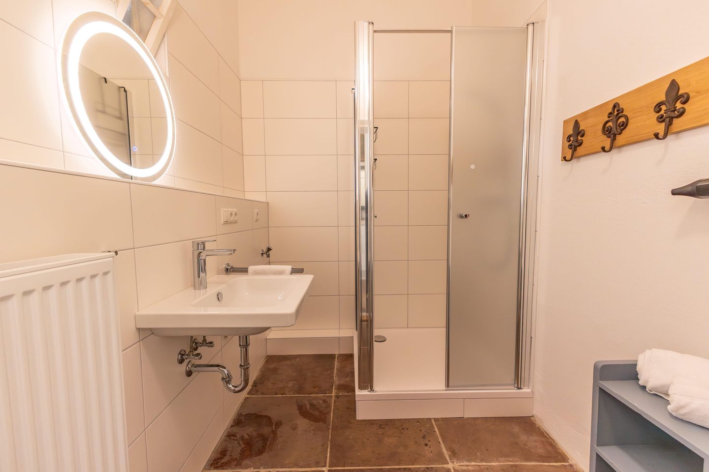 Die Wohnung verfügt über ein neues Badezimmer mit Dusche sowie eine separate Toilette, was insbesondere bei mehreren Gästen zusätzlichen Komfort bietet.