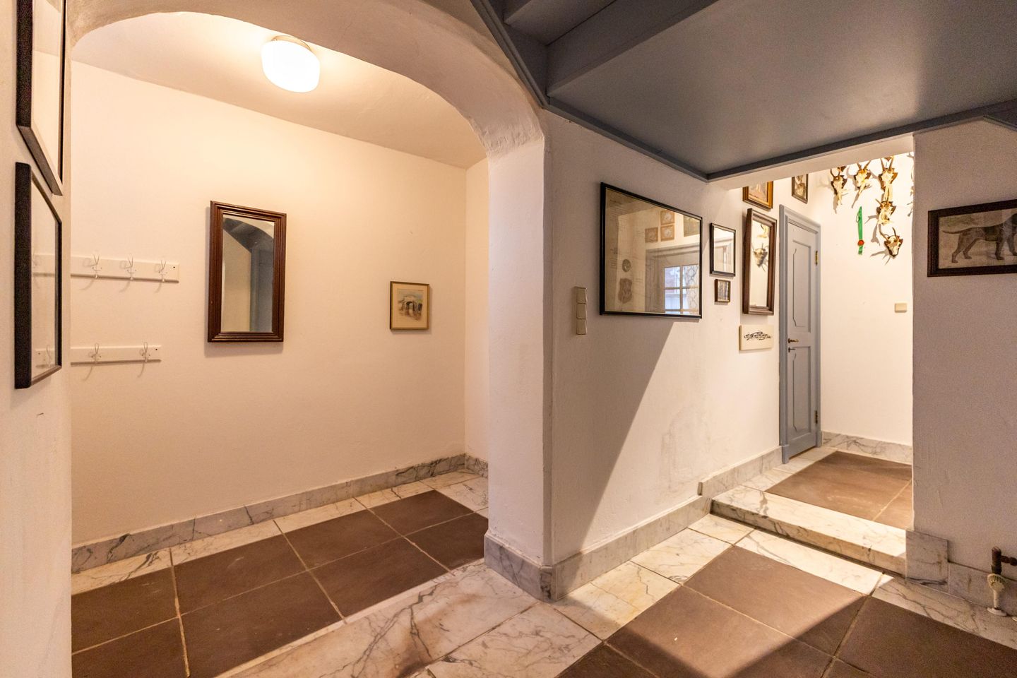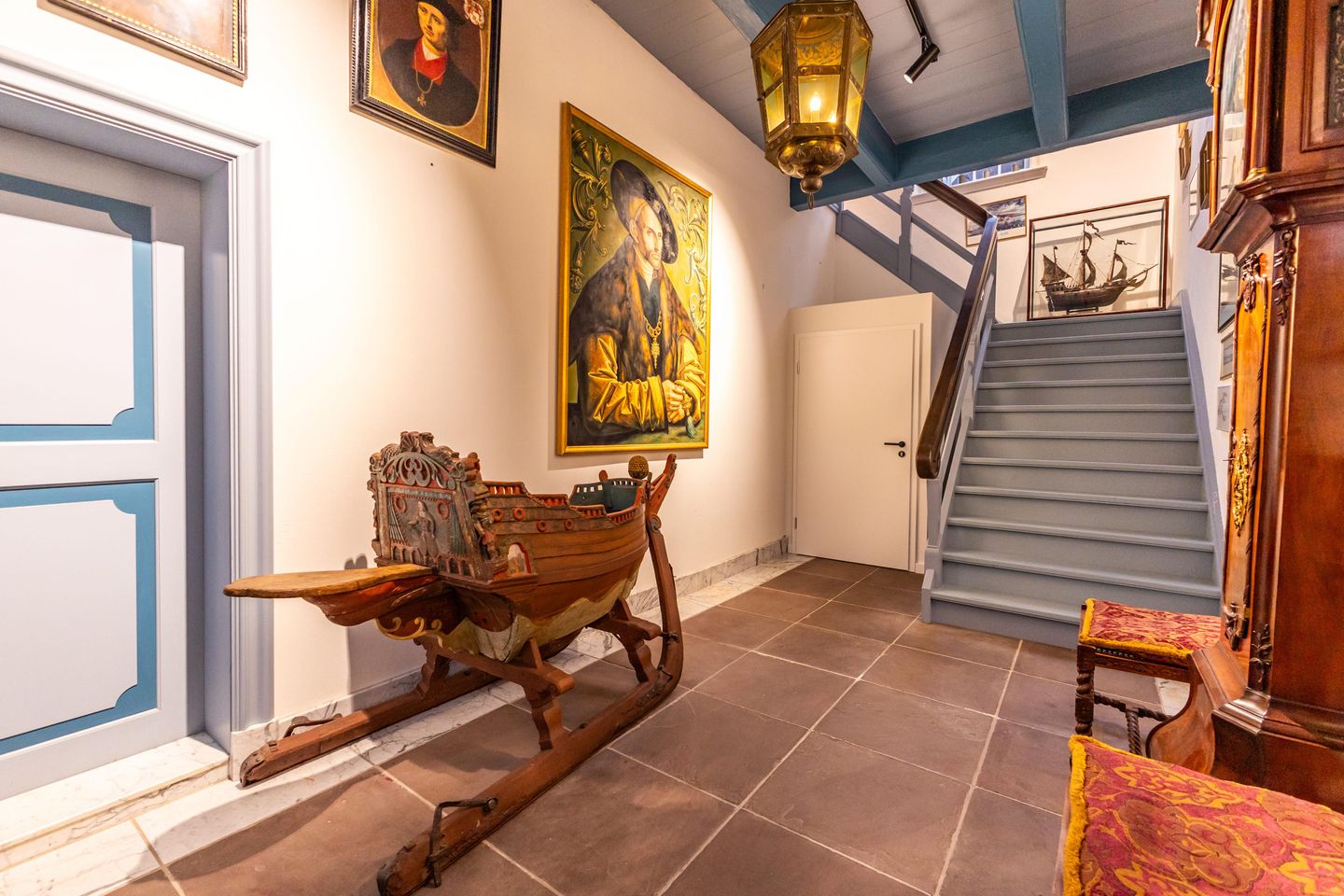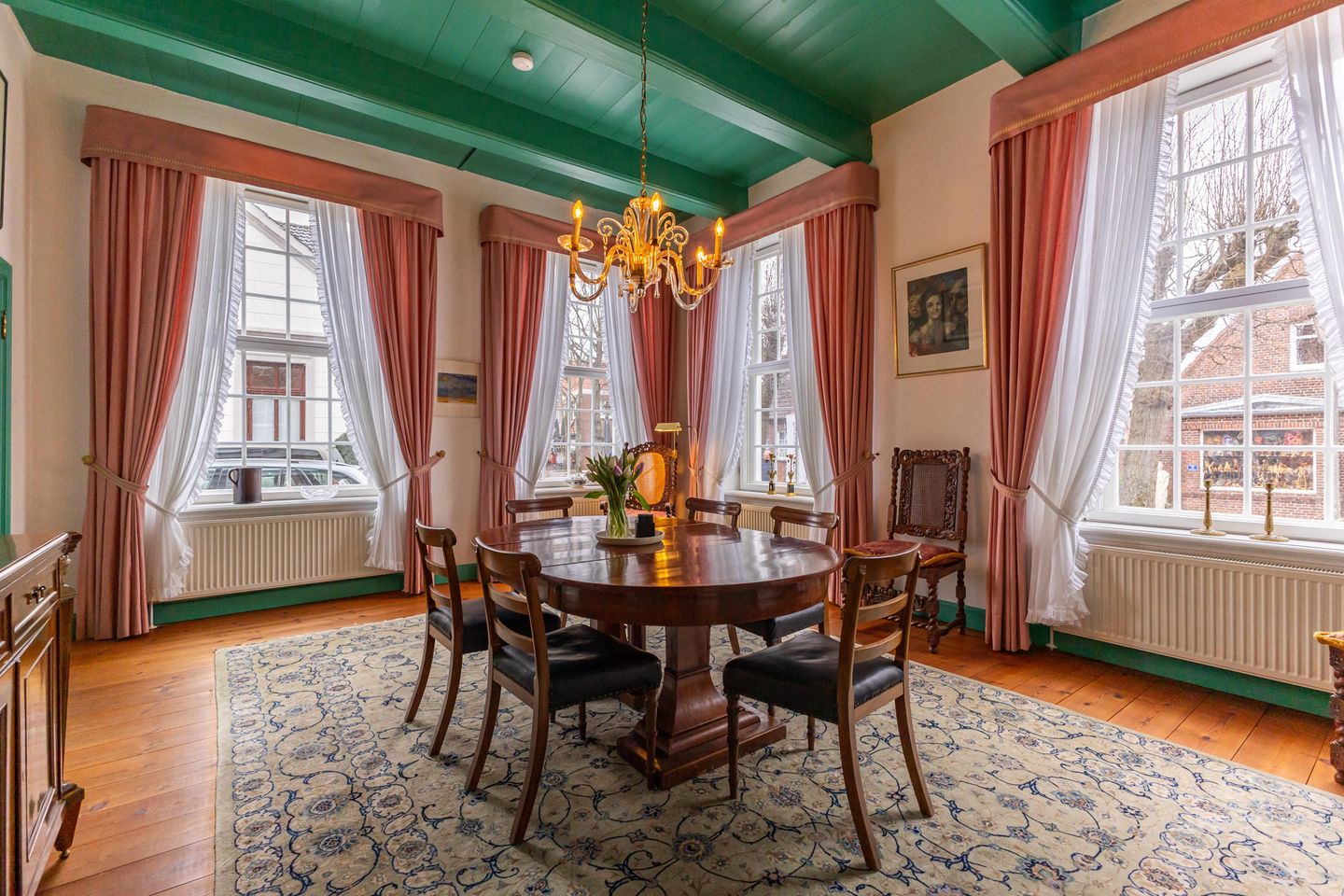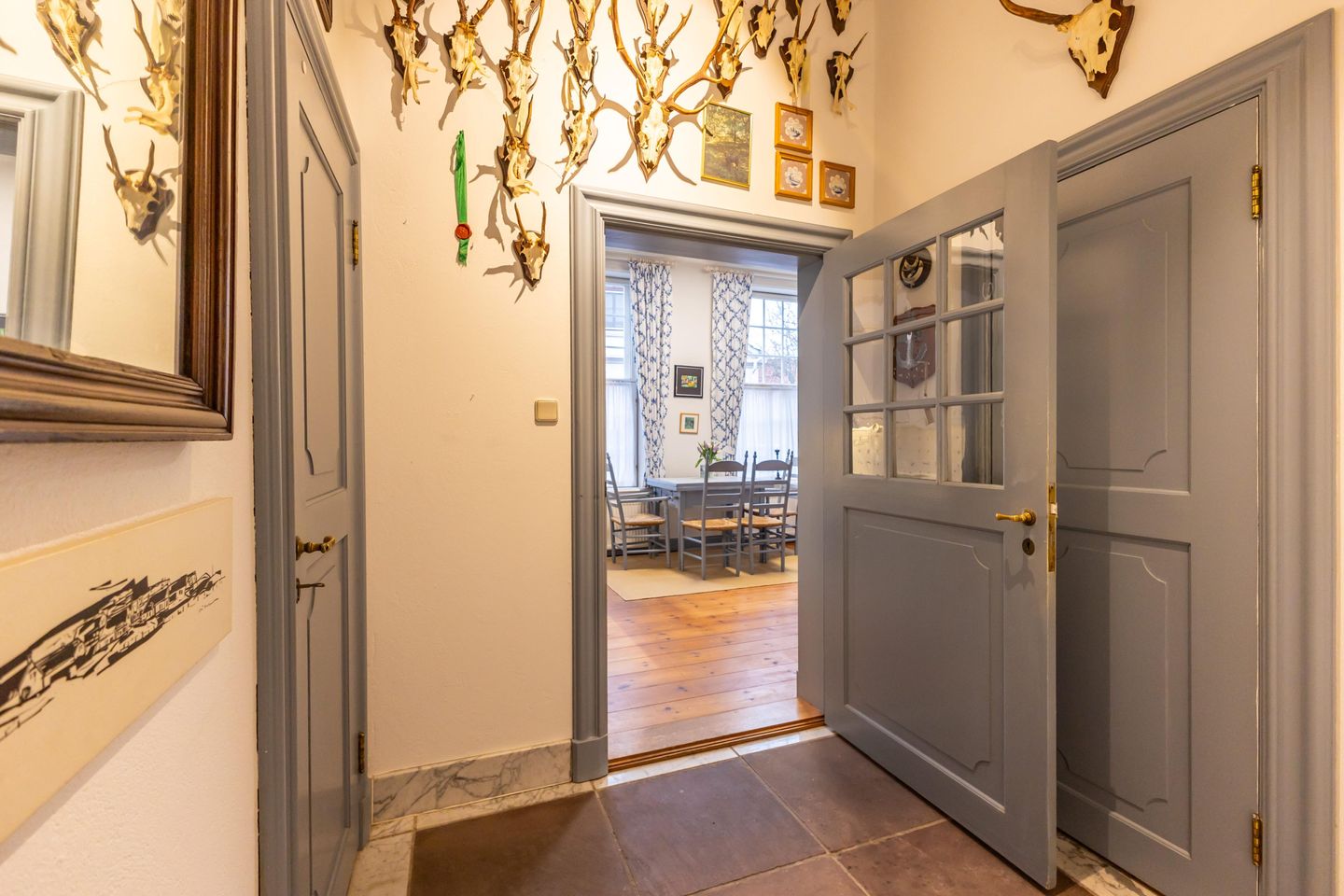 Zentraler Mittelpunkt ist das repräsentative Esszimmer, ausgestattet mit originalem, historisch erhaltenem Mobiliar. Massives, stilprägendes Interieur, ein großer Tisch, klassische Stühle und ausgewählte Gemälde schaffen eine ruhige, salonartige Atmosphäre, die den historischen Charakter des Hauses spürbar macht.