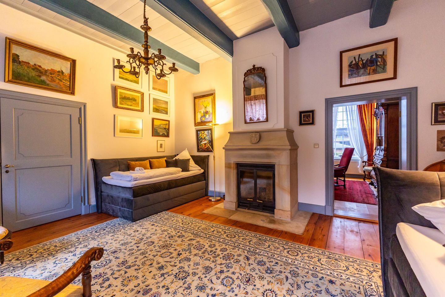 Von diesem Schlafzimmer aus gelangt man in das zweite, nach vorne ausgerichtete Hauptschlafzimmer mit Doppelbett. Ein schöner, historischer Schreibtisch und die ruhige Einrichtung verleihen diesem Raum beinahe eine bibliotheksartige Stimmung – ideal zum Lesen, Schreiben oder Abschalten.
