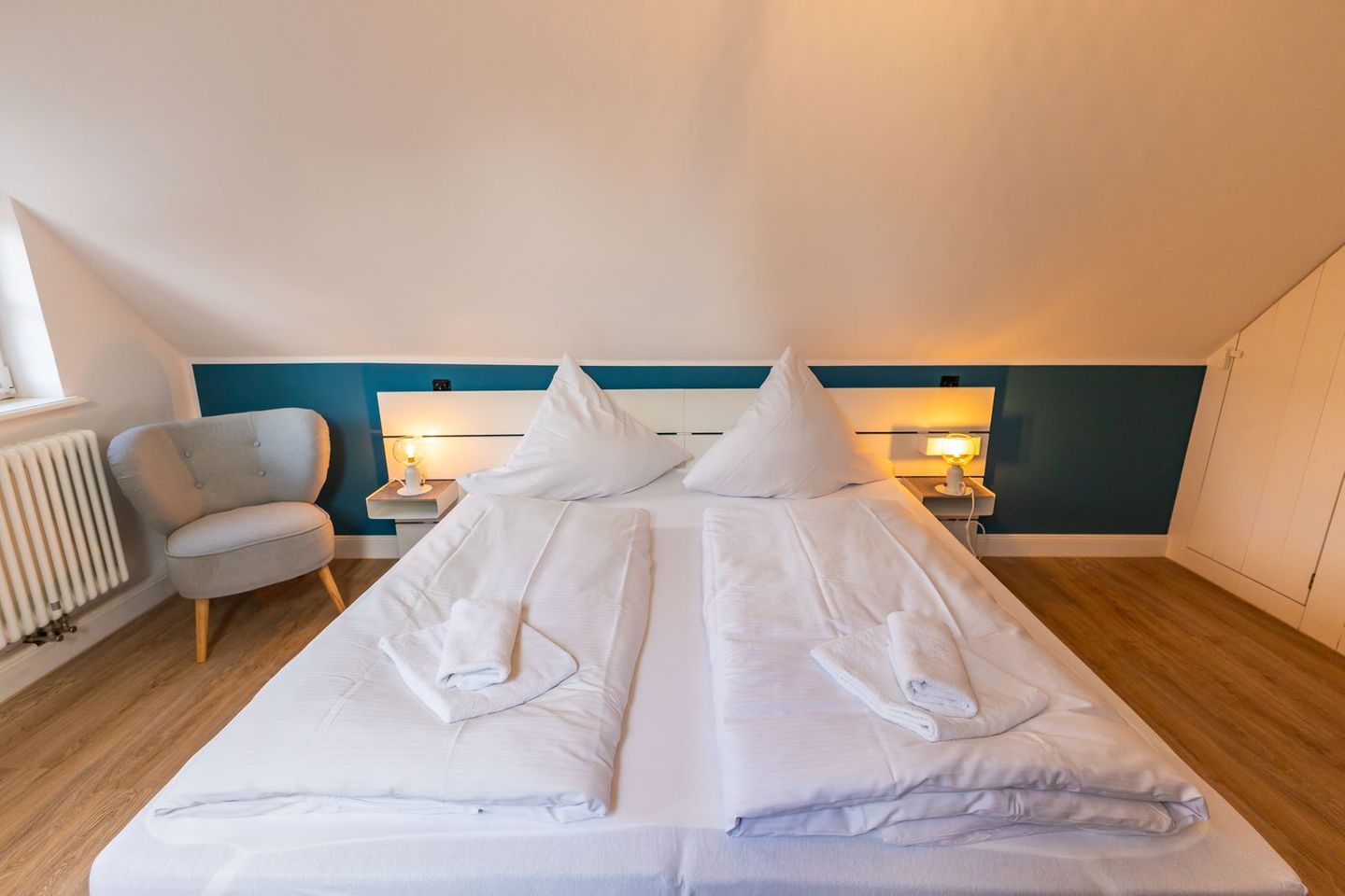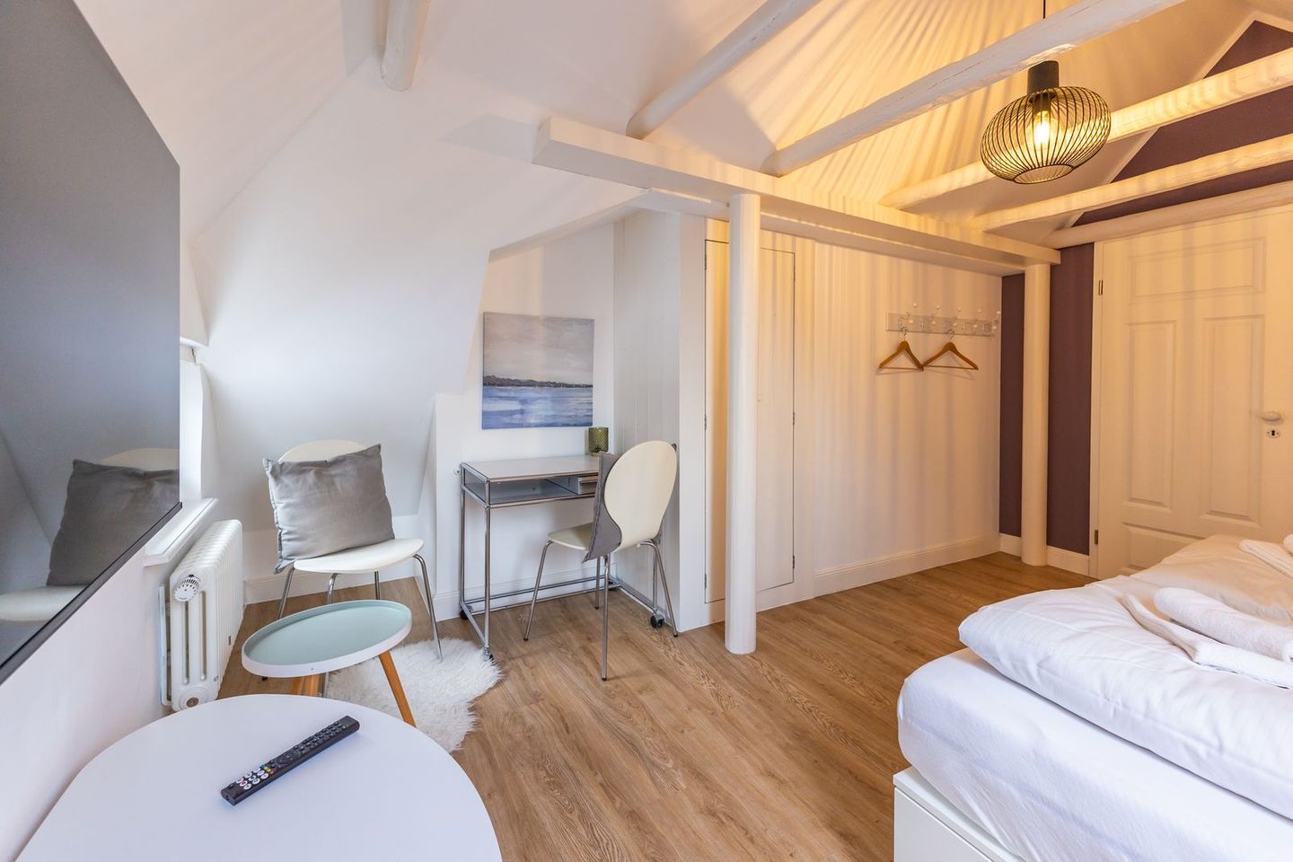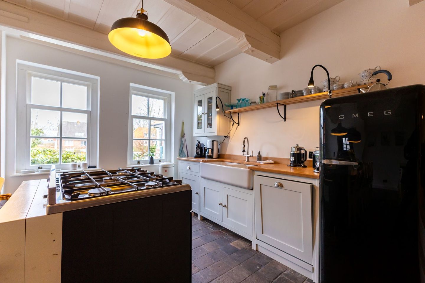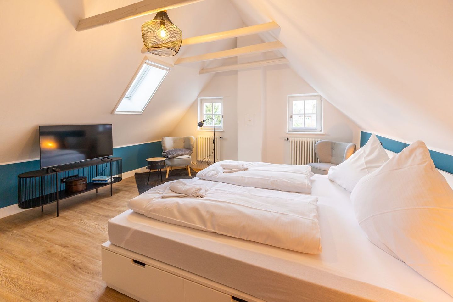 Im Inneren erwartet Sie eine großzügige Wohnküche mit viel Platz zum gemeinsamen Kochen, Essen und Lachen, ein gemütlicher Kamin für die kühleren Tage und der unverwechselbare historische Flair eines echten Fischerhauses.