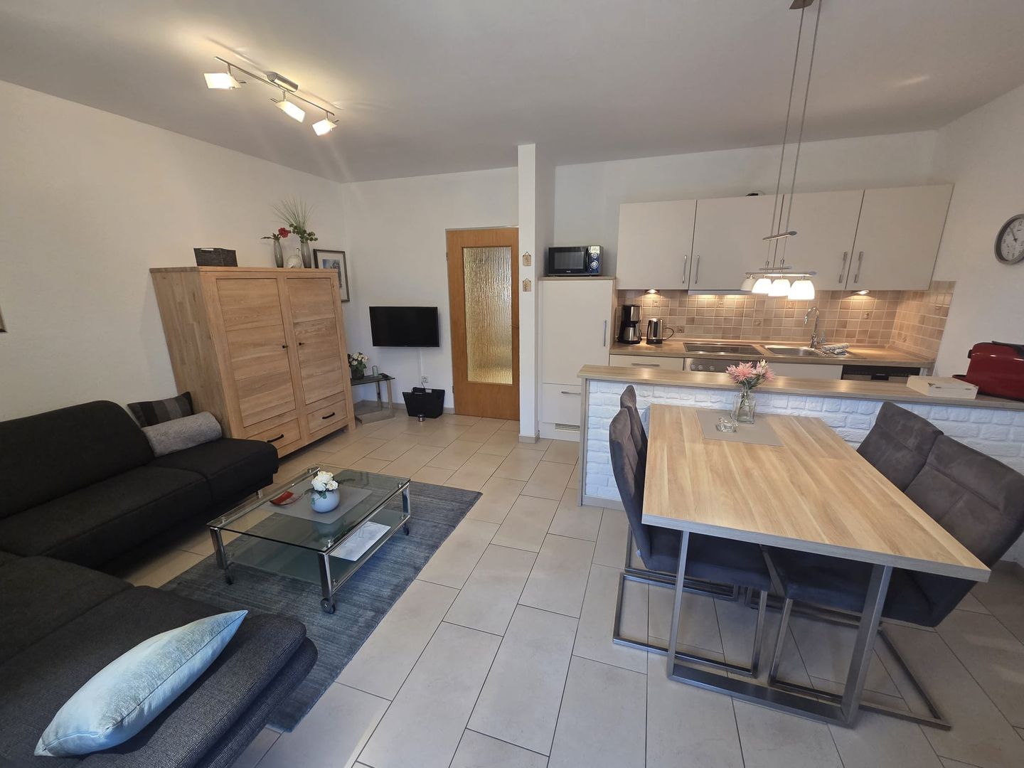 Das Wohnzimmer ist offen zur Küche, ein L-Sofa lädt zum Ausruhen ein, der Esstisch ist groß genug für alle. Die Küche ist komplett ausgestattet, von der Kaffeemaschine bis zum Herd, damit Sie sich selbst versorgen können.